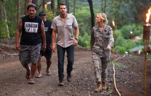 | COURTESY SONY PICTURES Native Hawaiian sovereignty activist Dennis "Bumpy" Kanahele, left, with Bradley Cooper and Emma Stone in a scene from "Aloha" that was shot at Kanahele's Waimanalo compound. The film opens Friday. |